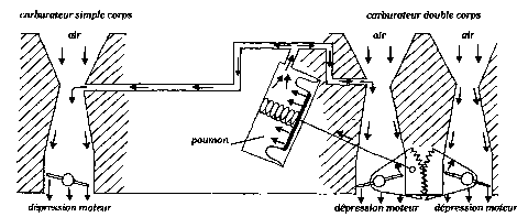 Deux carburateurs. Le premier, à simple corps, s'ouvre en fonction de la pression sur la pédale d'accélérateur. Lui seul fonctionne quand on conduit "pied léger". Le second, à double corps, s'ouvre en cas de forte pression sur l'accélérateur. Il se produit alors une importante dépression dans le 1er carburateur. Cette dépression agit sur une membrane qui commande le 2e carburateur.
